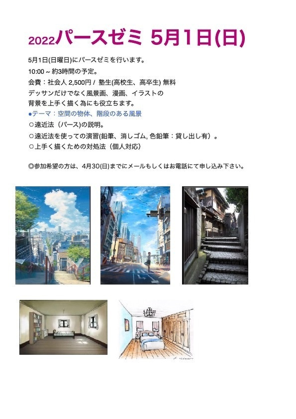 デッサン、作品作りの上達を目指します。お申し込みはお電話、メールでお願いします。