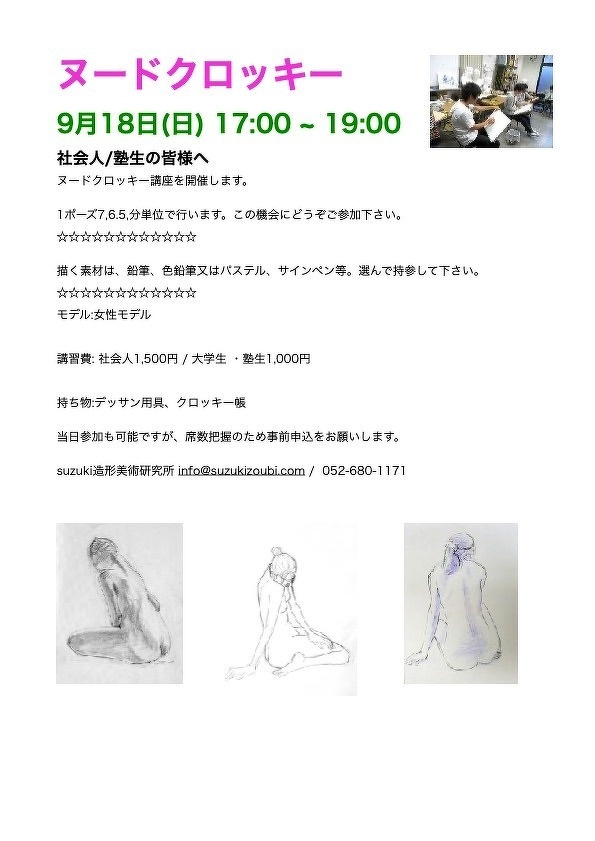 2022年08月25日(木) お知らせ 9月のヌードクロッキー会のご案内 次回ヌードクロッキー会は2022年の9月18日[日]17〜19時です。どなたでもご参加いただけます。 前回と開始時間が異なりますので、お気おつけください。詳しくはこちらをご覧ください。