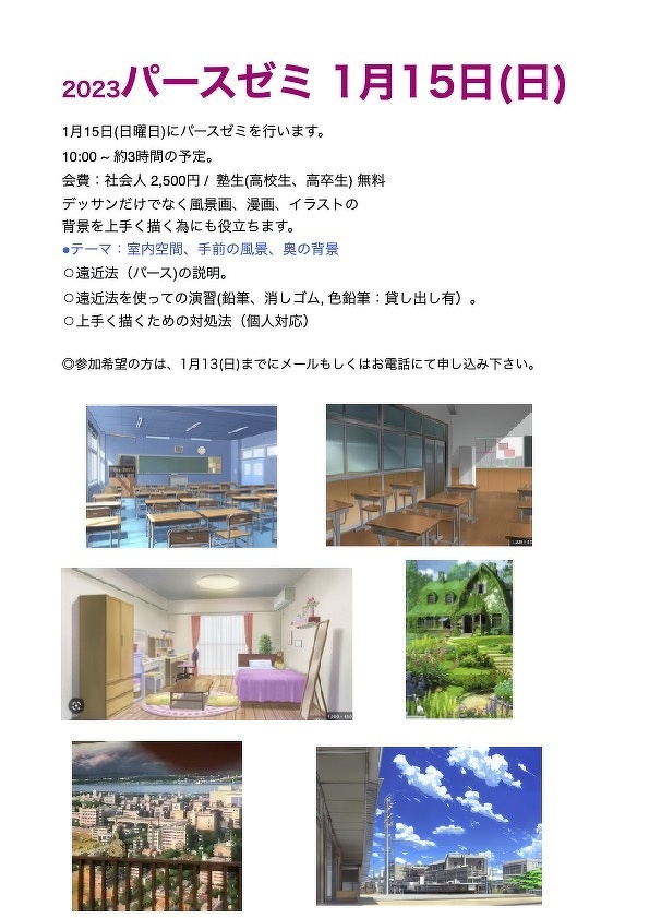 2022年12月05日(月) お知らせ 2023年1月15日[日]10〜13時 パースゼミのご案内 パースゼミ 2023年1月15日[日]パースゼミ開催します。10 : 00〜約3時間。初心者の方もご参加下さい。 デッサン、作品作りの上達を目指します。お申し込みはお電話、メールでお願いします。