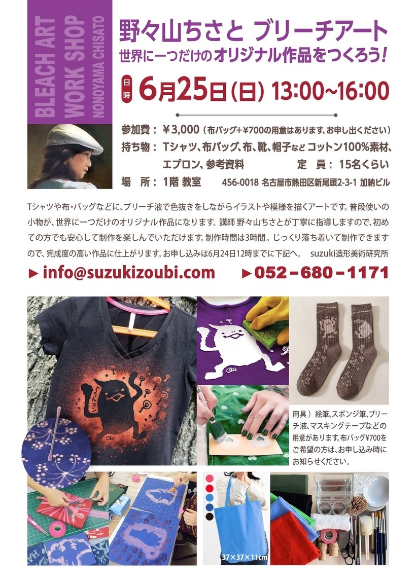 2023年05月31日(水) お知らせ 6月25日[日] 野々山ちさと ワークショップ イラストレーターズクラブ 野々山ちさとさんの ワークショップを開催します。 開催日時:2023年6月25日[日]13~16:00時 参加費:3,000円 お申し込み:6月24日[土]12時までにメールもしくはお電話でお申し込みください。 定員:15名予定。満席になり次第締め切ります。 塾生,社会人コースの生徒さん以外の方もご参加下さい。