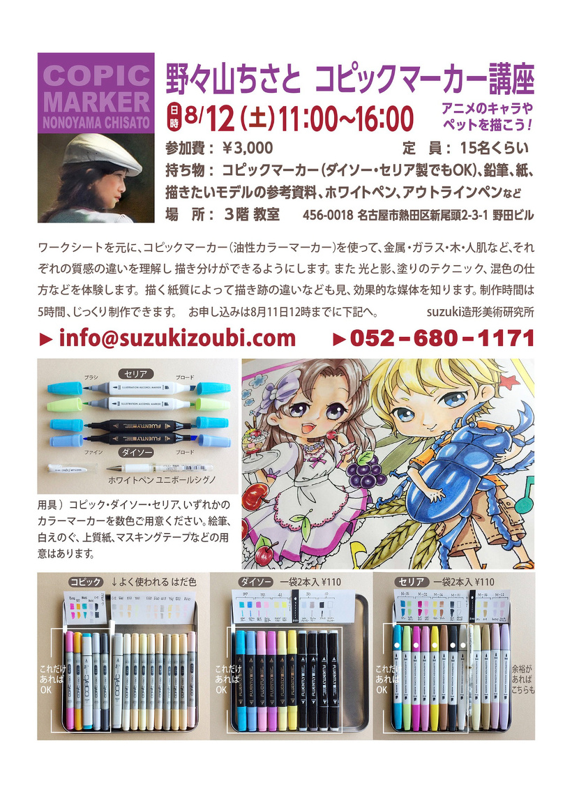 2023年07月11日(火) お知らせ 8月12日[土] 野々山ちさと コピックイラスト イラストレーターズクラブ 野々山ちさとさんの ワークショップを開催します。 開催日時:2023年8月12日[土]11:00~16:00 参加費:3,000円 お申し込み:8月10日[木]12時までにメールもしくはお電話でお申し込みください。 定員:15名予定。満席になり次第締め切ります。 塾生,社会人コースの生徒さん以外の初めての方もご参加下さい。